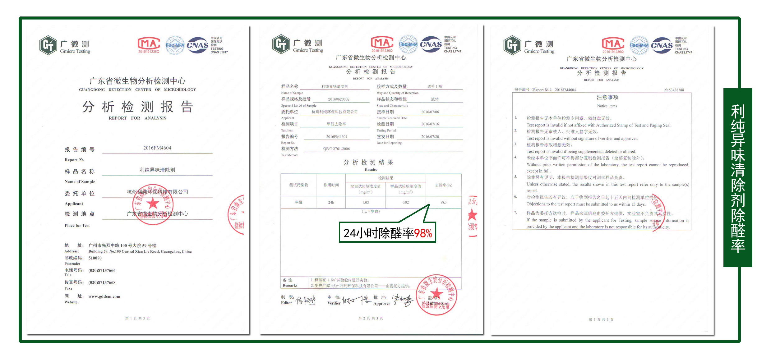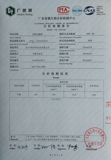 异味清除剂除醛率报告
