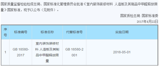 根据2017年4月22日中华人民共和国国家标准公告(2017年第9号)“关于批准发布《室内装饰装修材料 人造板及其制品中甲醛释放限量》国家标准的公告”,由全国人造板标准化技术委员会归口管理的《室内装饰装修材料 人造板及其制品中甲醛释放限量GB 18580-2017》国家强制性标准正式颁布,并于2018年5月1日开始实施。