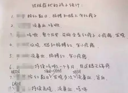 家长反映:该学校从2016年开始为幼儿园部建造新教学楼,于2016年下旬建成并装修,校方以释放室内有毒气体为由,告知家长们暂时不搬往新幼儿园,对此家长们很理解和支持校方工作。今年开学初学校在微信家长群出示了相关环境检测合格的报告。在3月初幼儿园室外活动室仍在建设中(有土堆,未放置大型玩具…)。幼儿园于4月初开始搬往新园,虽然仍有家长对环境质量提出质疑,但是园方依旧以环境报告合格为由搬入新楼,与此同时新楼西侧室外活动区域仍在建设(包括刷新周围的墙,铺人造草坪,环境布置等)。搬入新园初期,孩子上课,游戏等活动在新园,午休在旧园。经过一段时间,家长们私下聊天讲到自己孩子会流鼻血,出皮疹,面部红热,发高烧,咳嗽,肺炎等症状,4月底就有小规模的发烧情况。