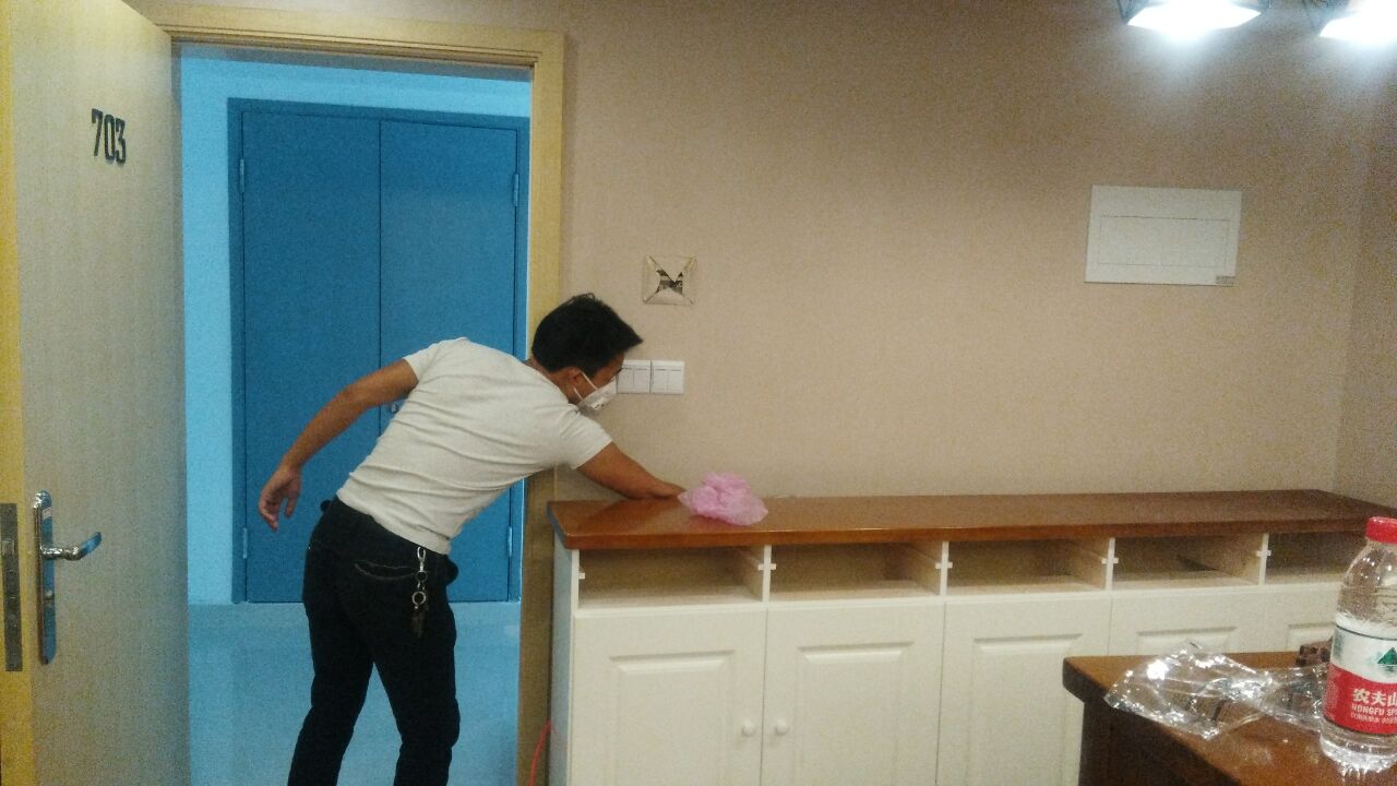 治理方案及施工:公司针对其房屋结构特点及污染情况,我公司技术及施工人员采用专项治理的施工方案,针对其墙体立面(墙纸)、沙发、橱柜等污染源表面使用我公司自主研发的利纯纳米光触媒进行甲醛清除,采用高压雾化喷涂的方法,最大限度消除室内的甲醛污染,对于重新刷漆的家具、门、书架、衣柜等采用甲醛清除剂进行处理,对于床底部位则使用生物酶异味清除剂,针对不同污染物,做全面治理,治理后的室内环境达到国家规定的室内空气质量指标范围内,业主对我公司的治理给予充分肯定。下面为施工现场照片: