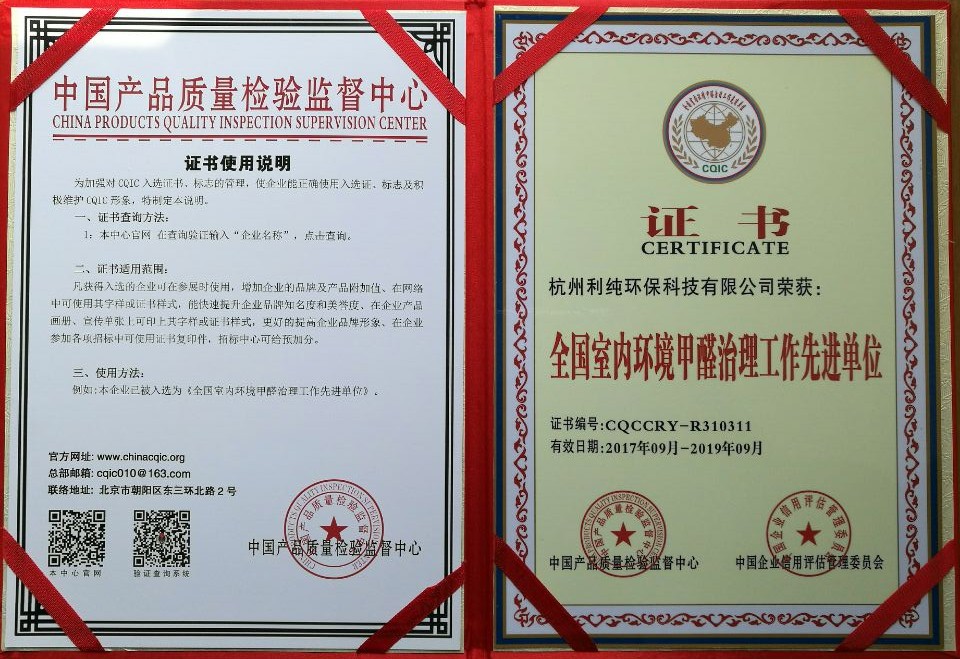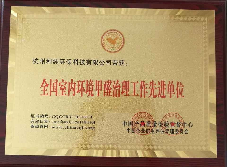 2017年9月,由中国产品质量检验监督中心和中国企业信用评估管理委员会联合举办的针对全国室内环境甲醛治理行业优秀企业评选中,利纯环保在此次参加评选的的近400家同行企业中,评委会通过对公司产品质量、技术、人才培训、企业信用、工程案例、客户反馈、品牌建设等多维度多角度考核,经过多轮测评淘汰,利纯公司综合测评分名列前茅,最终被评为全国室内环境甲醛治理工作先进单位。