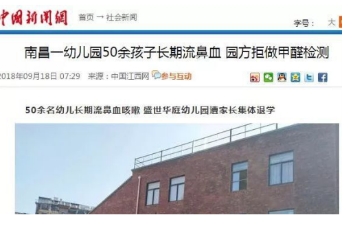 据中国新闻网报道, 9月17日,刚刚开学不久,由香港YM教育集团投资创办的南昌经开区奥克斯盛世华庭幼儿园遭到家长集体退学。家长们告诉记者,该幼儿园园开学一年来,已有50名幼儿频繁流鼻血、咳嗽。家长们都怀疑是学校甲醛超标引起的,但是园方却拒不配合检测,且处理态度十分恶劣。出于对孩子健康的担忧,几十名家长不得不让孩子退学。